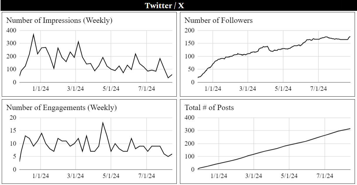 Honestly, I let the Twitter/X account hit the backburner this quarter as everything was prescheduled when I began my summer internship and during the summer I focused my efforts on the rebrand. The good part was that the number of followers remained constant and the number of engagements per post remained relatively constant. Impressions dipped, but I hope to have a rebound this upcoming quarter.
