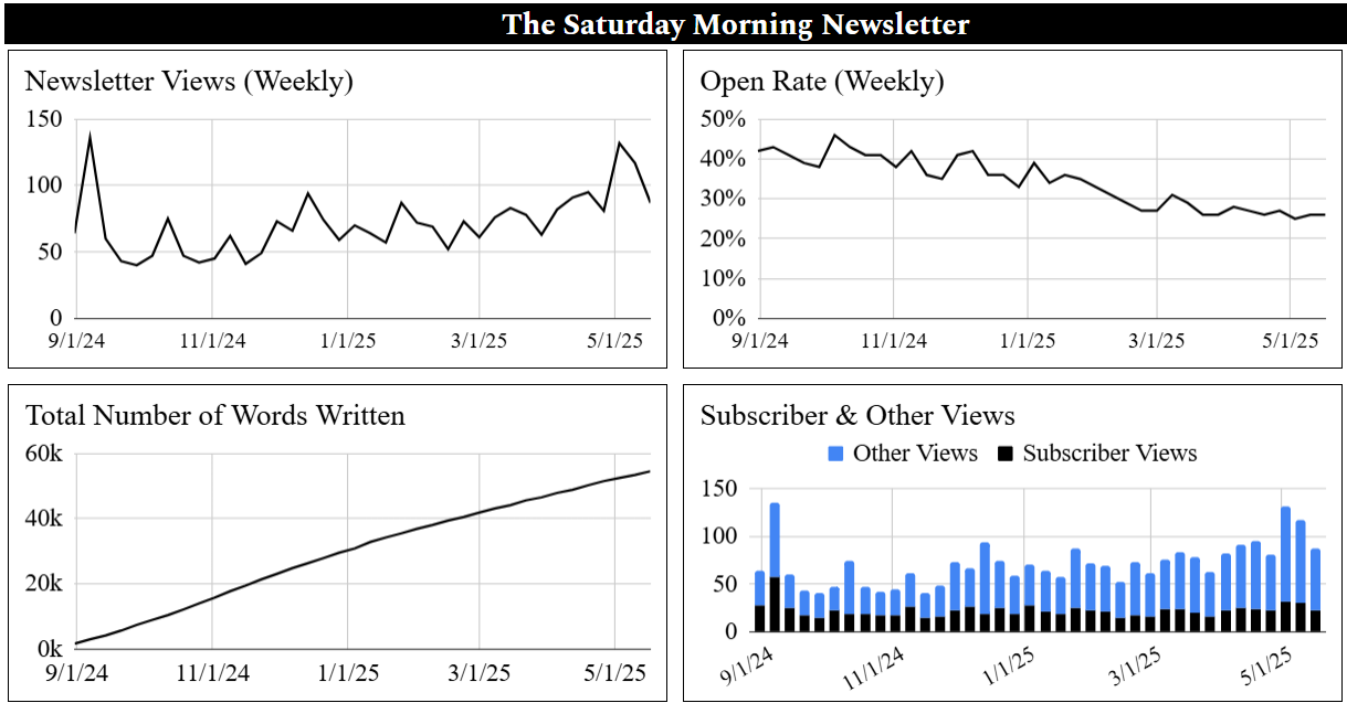 Views continue to increase, averaging around 80-100 views a newsletter, with great engagement on each post. Open rates are slightly down due to the increase in subscribers, but overall, the growth and consistency here have been great. I’m excited to see how this project grows in the coming quarters.