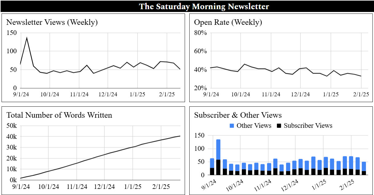 Views are going up, averaging around 50-70 views—with great engagement on each post. Open rates slightly down due to the increase in subscribers, but overall the growth here has been great. I’m excited to see how this project grows in the coming quarters.
