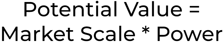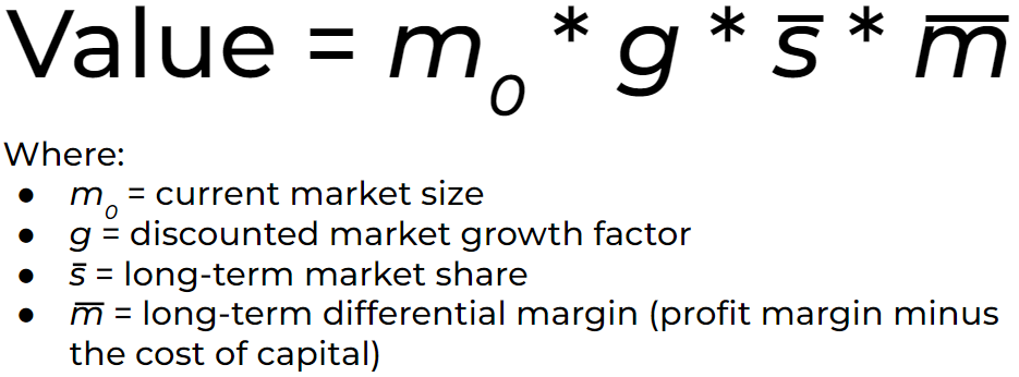 In this equation, the product of m0 and g reflects market scale over time (current market size * discounted market growth factor). Referring back to the definition of strategy above (“a route to continuing Power in significant markets”), this portion refers to the “significant markets” part.