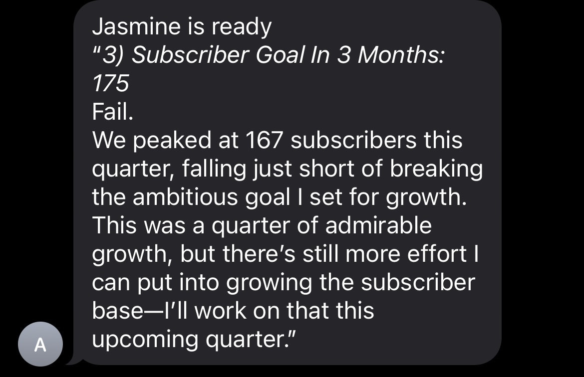 The day after I published the Quarterly Update in May, detailing how I missed my subscriber goal, I received the following message from my friend Abbey: