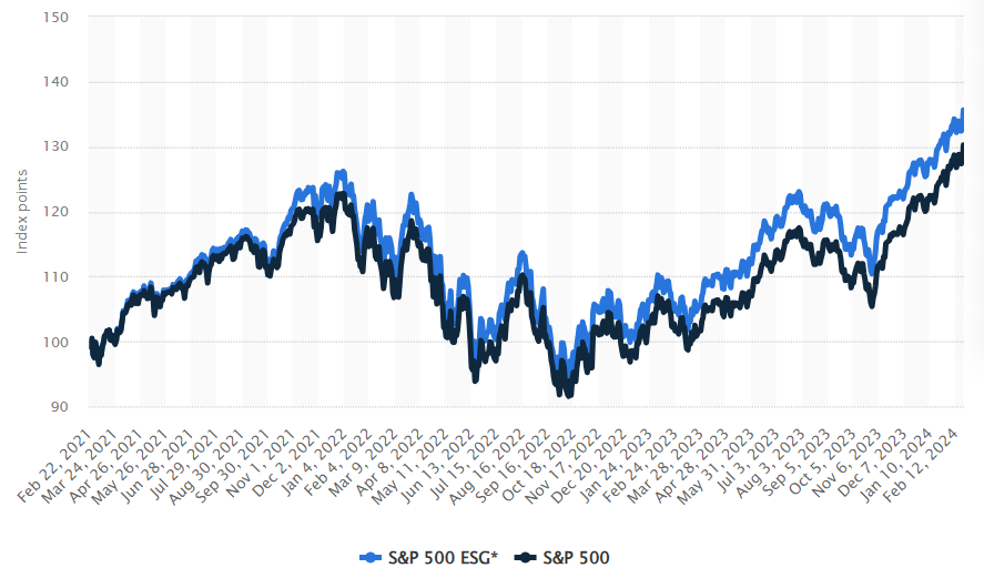 Here is a graph from Statista comparing the S&P 500 index vs. the S&P 500 ESG index from 2021 through 2024: