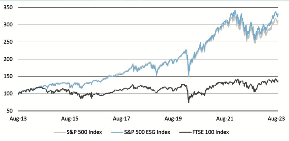 Taking a longer viewpoint, comparing the S&P 500 index vs. the S&P 500 ESG index vs. the FTSE 100 index (the United Kingdom’s version of the S&P 500) from 2013 to 2023: