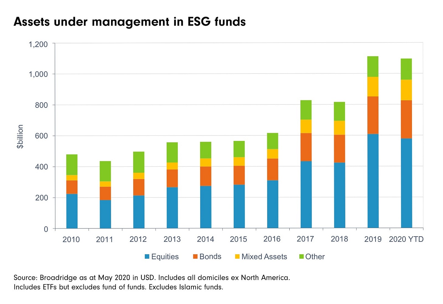 Here’s a graph from Fidelity UAE showing the number of assets under management (how much money a portfolio has) of all of the different ESG funds out there: