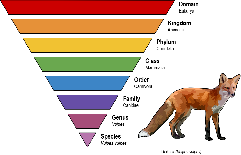 Nested hierarchies describe systems where smaller components are contained within larger ones, creating a series of levels (a series of groups within groups). Along the nature theme, you probably learned about classification and taxonomy systems in your biology class (pictured below):
