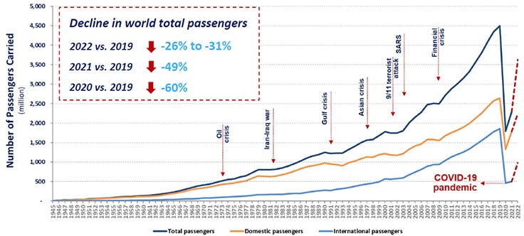 Unfortunately, those small changes made over the preceding century proved a perfect breeding ground for the worldwide COVID-19 pandemic. The image below shows the number of airplane passengers over time (showing the large effect of the pandemic).