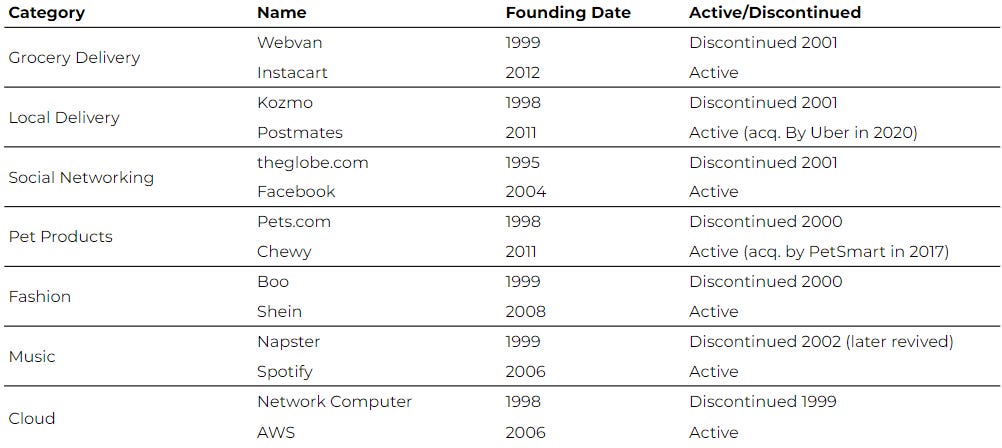 Bringing us full circle to the example of Pets.com (Company A) and Chewy (Company B) from above, here is a more built-out list of all of the companies founded in the dot-com bubble that were simply too early: