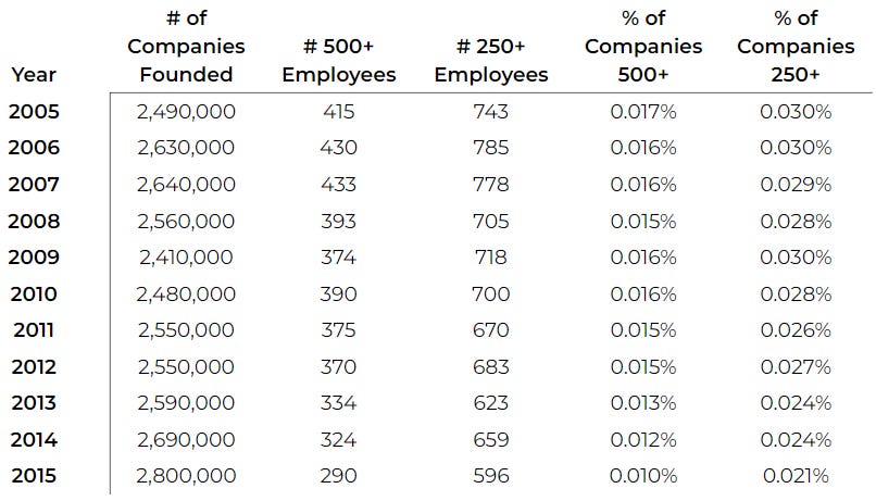 Here is a table of the number of companies founded from 2005 - 2015 and the number of companies with 250 or more employees (via Pitchbook):