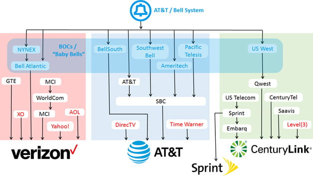 Fast forward to the 1970s. AT&T’s services reached around 90% of United States households. Then, in 1982, after 8 years of a lawsuit the Justice Department made AT&T break up its business into 7 smaller regional operating companies (see chart above).