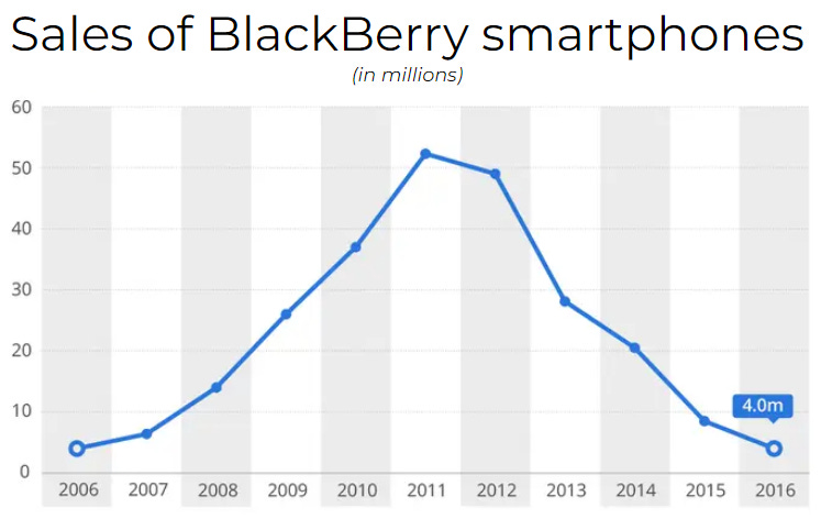 The best example from above would be Blackberry. They controlled a large portion of the United States market in the early 2000s, but now in 2024, you’d be laughed out of a room if you said you had a Blackberry phone. Why?