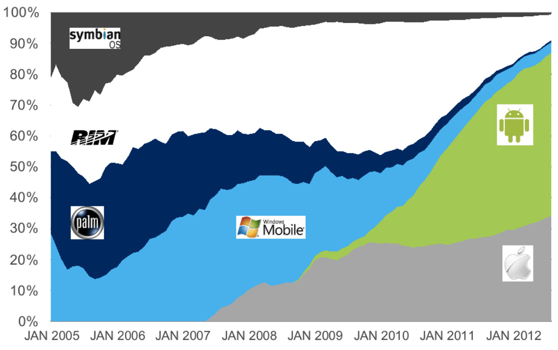 Many large competitors emerged. The biggest were Apple (iPhone) and Samsung (Samsung Galaxy).