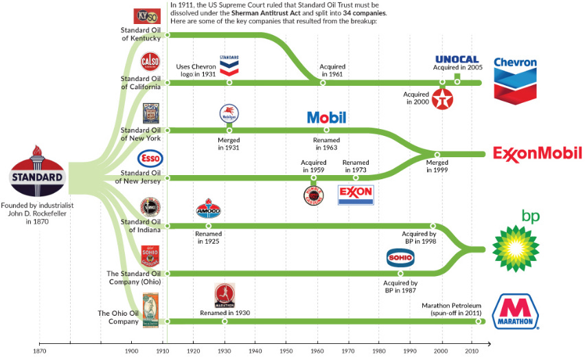 Because of competition from other firms, their market share gradually eroded to 70 percent by 1906. In addition, in 1906 an antitrust case was filed against Standard. The lawsuit lasted 5 years and upon conclusion, Standard Oil was ordered to break up their company into 6 smaller companies (see chart below).