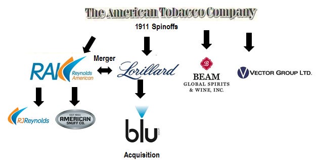 The victory was short-lived, however, because in 1911 the United States Court of Appeals judged this tobacco trust in violation of the Sherman Antitrust Act and ordered it to be dissolved (see chart above).