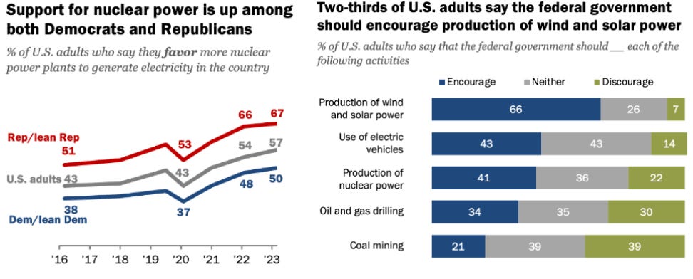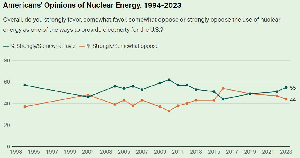 Data from the Pew Research Center states that around 57% of United States adults favor more nuclear power plants: