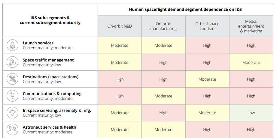 In Deloitte’s 2023 report “The Commercialization of Low Earth Orbit”, Deloitte breaks down the low earth orbit infrastructure into the following segments: launch services, space traffic management, destinations (space stations), communications & computing, in-space servicing, in-space manufacturing & assembly, and astronaut services & health.