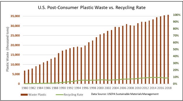 Put another way, it’s estimated that as of 2015, around 9% of plastic waste generated historically had been recycled, 12% had been burned, and the other 79% was accumulating in landfills or was across the natural environment.