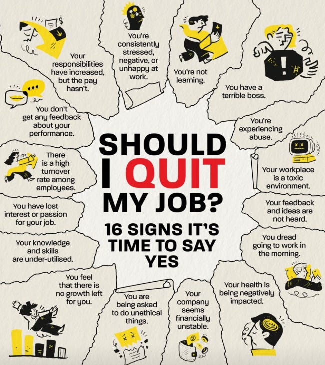 Today, the interesting thought of the week relates to an interesting chart I saw on Reddit the other day, describing 16 signs you should quit your job. See below: