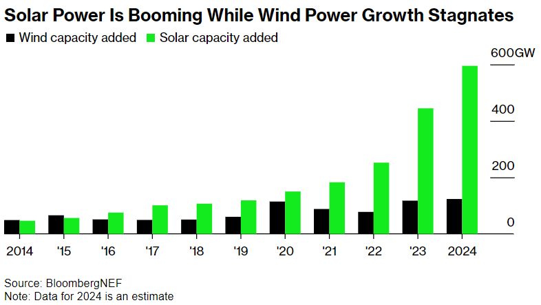 Solar deployment is accelerating, yet wind energy isn’t keeping up the same pace. Solar installations are forecasted to increase by 34% in 2024, yet wind is only expected to increase by 5%. Bloomberg includes the following graph, which showcases energy growth over time: