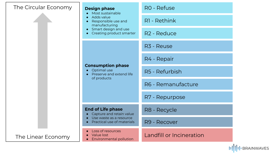 There are 9 steps that can capture some value from materials or products before everything is lost, with the level of capture increasing as you go higher up the ladder. In the linear economy, new raw materials are continuously needed, and waste increases accordingly. In a circular economy, using the R Ladder, we ensure that products and materials retain their value and waste is critically limited.