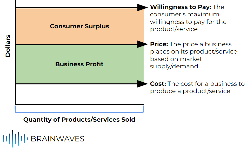 Consumer Surplus: The difference between what a consumer is willing to pay for a product or service and what they actually pay. It represents the additional value the consumer receives beyond the price they paid. In equation form: Consumer Surplus = WTP - Price