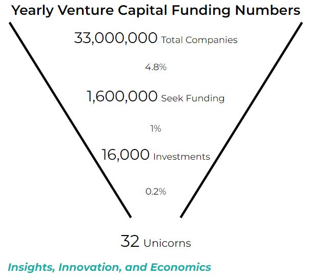 Dismal right? Each company that seeks funding from the United States every year has a 1 in 50,000 chance of becoming the next Unicorn. Even from a Venture Capital perspective, each company you actually invest in only has a 1 in 500 chance of becoming the next Unicorn.