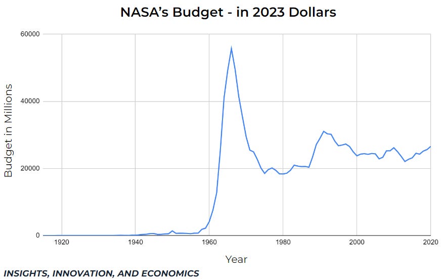 "NASA's portion of the federal budget peaked at 4% in 1965," Walter Cunningham, an Apollo 7 astronaut, said during congressional testimony in 2015.