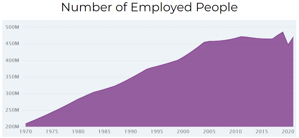 India’s GDP is directly correlated with the number of people employed (the number of jobs). This makes intuitive sense as in order to produce more GDP (make more money) you have to do one of three things.