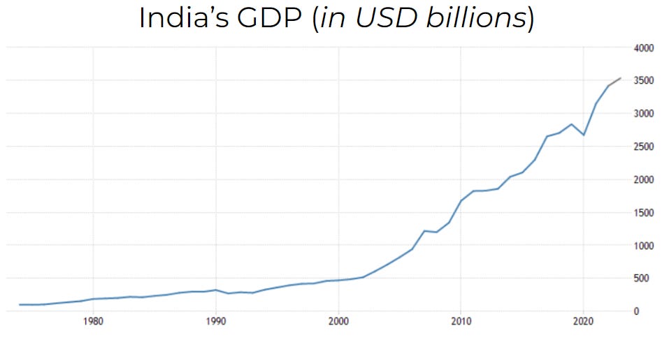 Thesis: Given its population size and rapid economic growth, I expect India will be the next powerhouse nation. This is truly impactful from an economic and innovation standpoint, as much of the newer growth in production capabilities and new inventions will be coming out of India. Countries with partnerships with India will benefit immensely from this relationship.