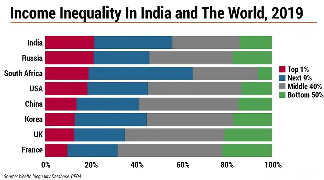 Like many rapidly developing nations, some individuals in key areas of the economy can capture a lion’s share of the value as personal wealth. Oxfam International cites that the top 10% in India hold over 77% of the total wealth.