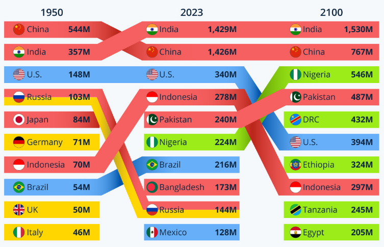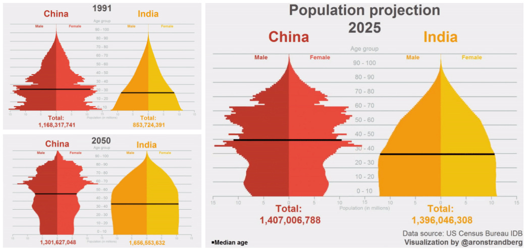 As you can see, in the 1990s India and China’s populations looked similar to each other (lower average age - denoted by the black bar), yet China stopped having children. You can see the lower part of the 1991 graph almost perfectly near the average line on the 2025 section. Yet, India throughout this time has continued to have children, producing steady population growth.