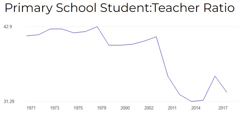 Even as so many kids have started going to schools, the number of schools being built and the number of teachers in those schools has steadily gone down over time, signaling better education prospects.