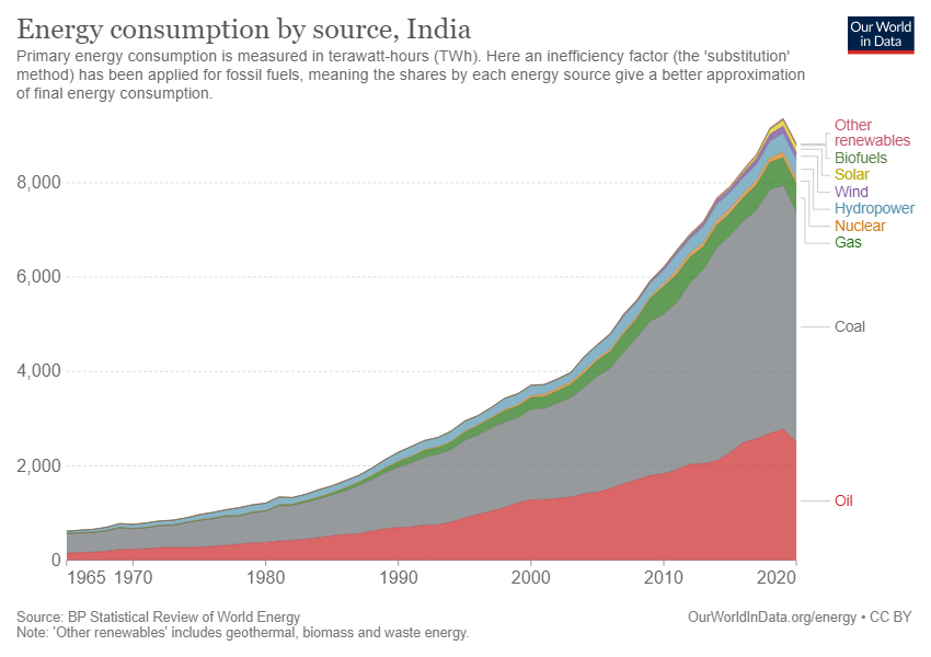 As you can see, to match the exponential population growth and exponential GDP growth, India has grown its energy production capabilities similarly. Only with energy capabilities do modern societies grow.