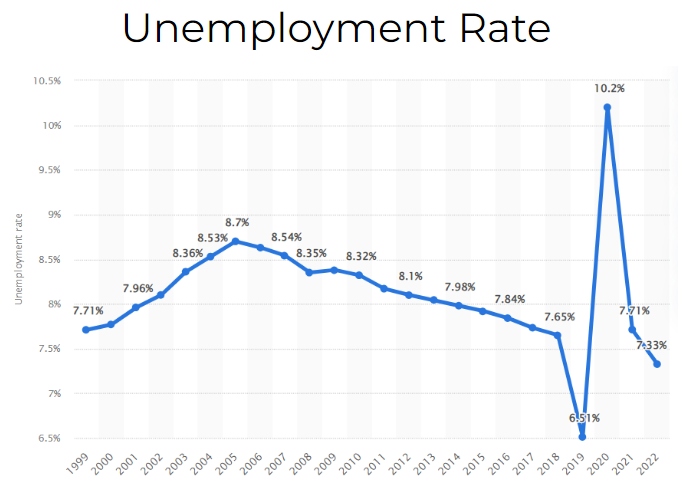 Throughout the recent economic expansion, the unemployment rate in India has remained relatively constant, even slowly decreasing over time. In this time, India’s population has grown around 50% (almost 500 million).